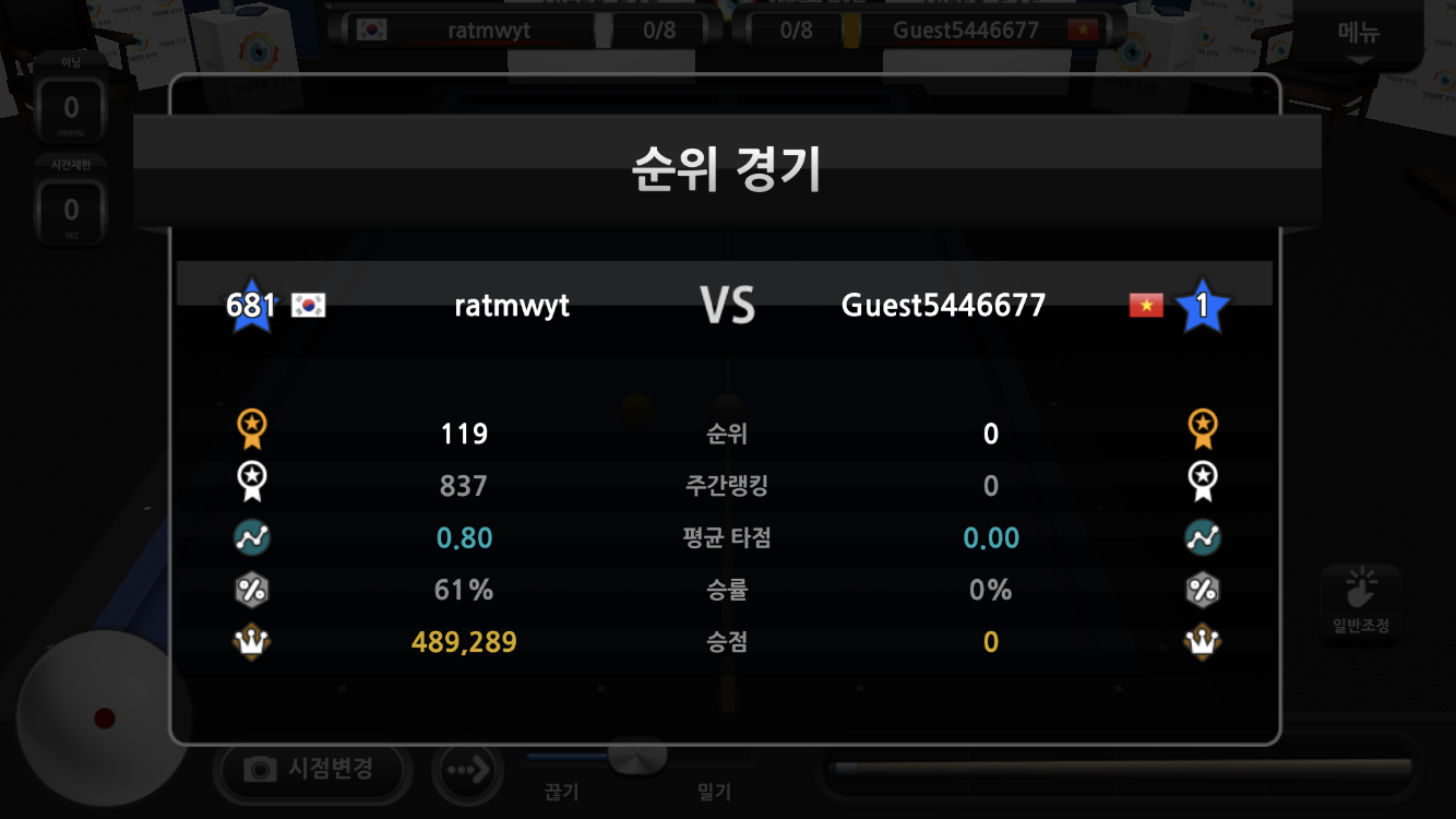 에버리지가 낮은 유저와 경기할때는 상대방은 힘당구를 많이 칩니다. (하수와 만나면 재미가 떨어지는 경우가있습니다)