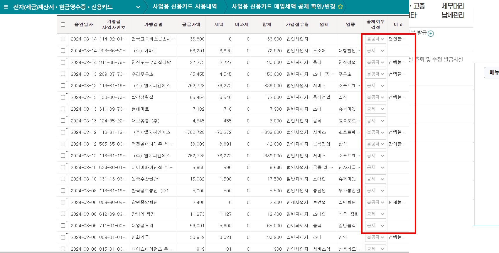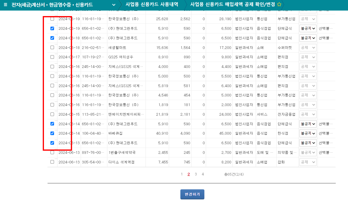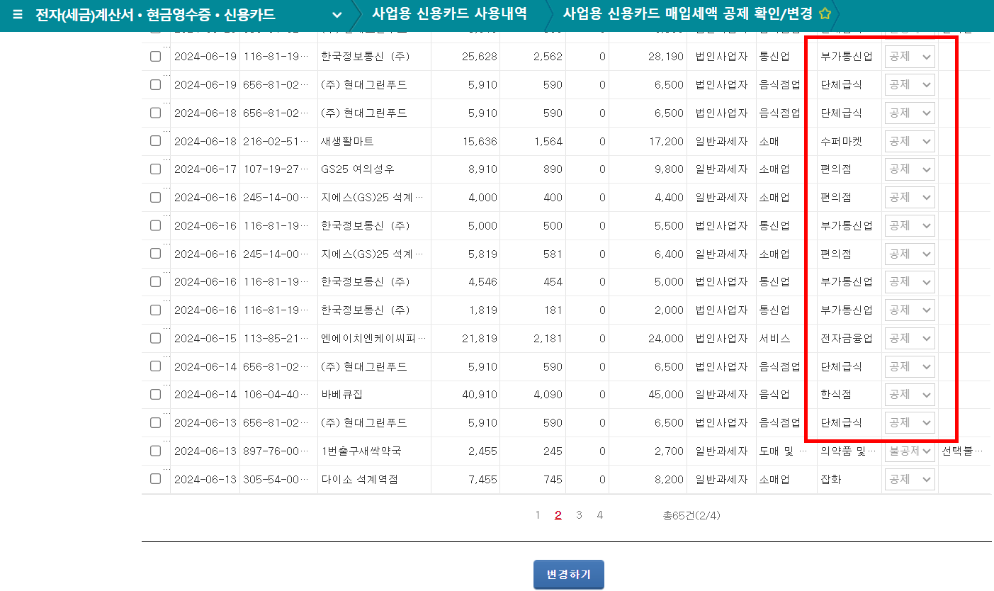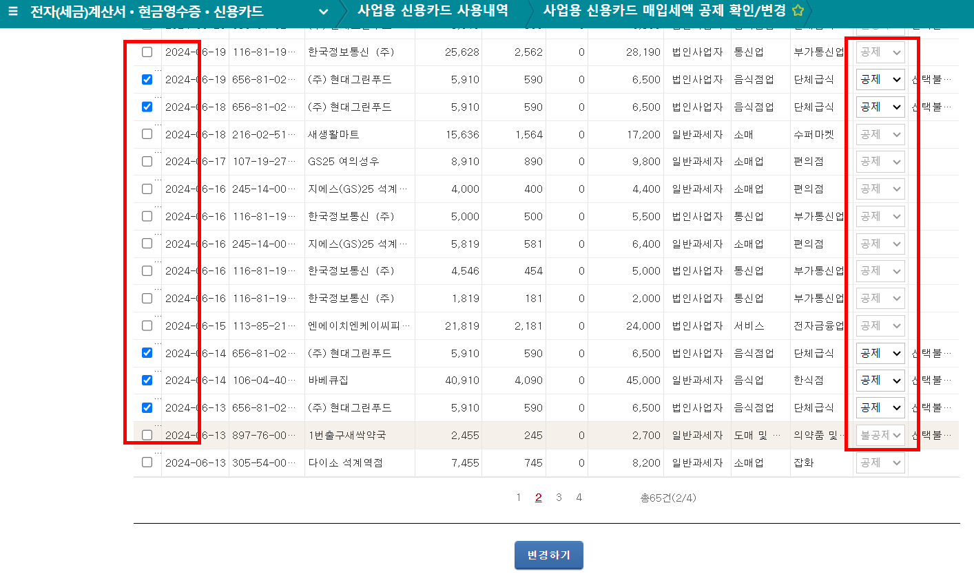 불공제로 변경하고 나서 변경하기 버튼을 누르면 해당건은 변경되어 있는걸 확인하실 수 있습니다.